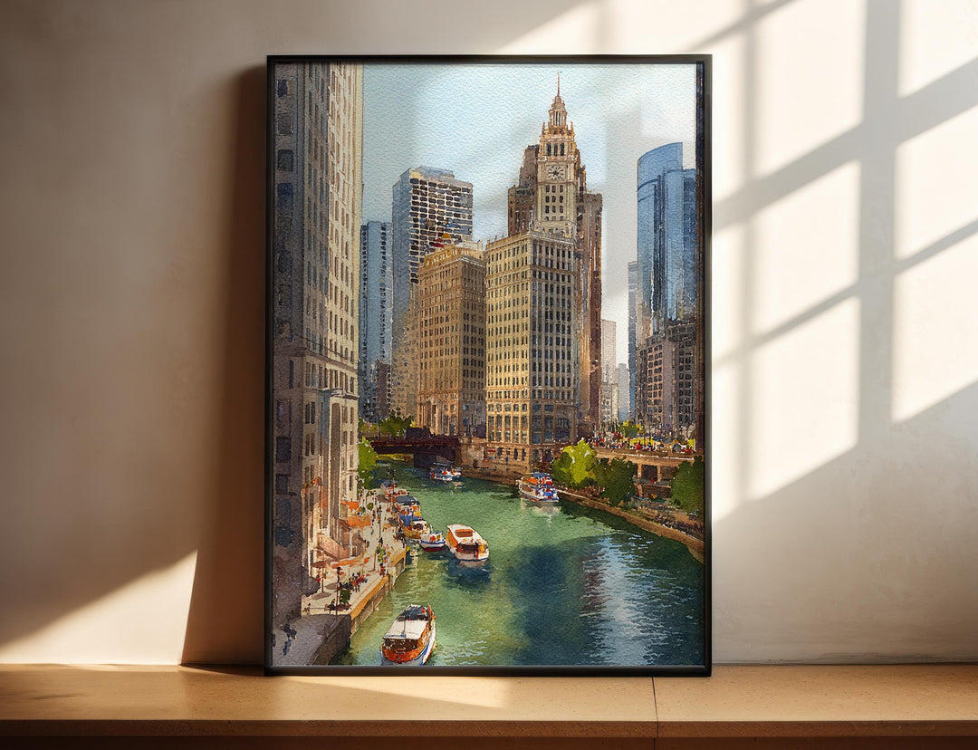 Chicago IL Wall Art, Chicago Skyline Print, Chicago River Watercolor Art, Chicago Gift, Travel Print, Travel Poster, Housewarming Gift